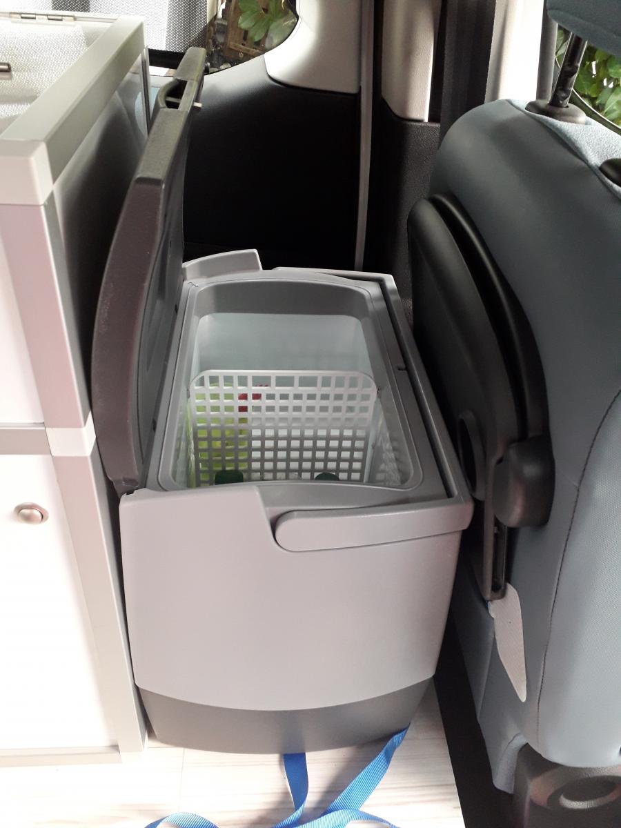 Jetzt war ich aber angefixt und wollte versuchen, auch bei mir wieder eine komfortable Sitzposition zu erreichen. Ein Abmontieren des Tabletts schien auf den ersten Blick komplizierter. Dann fiel mir abends, kurz vorm Einschlafen (man kennt das ja, die Gedanken fliegen dann geradezu) ein, dass ich ja vielleicht auch einfach die Kühltasche um 180° drehen könnte, sodass der Deckel nicht zum Fahrersitz hin hochgeht, sondern zum Koch-/WC-Modul. Heute also schnell umgeräumt und siehe da: ich kann die Sitzlehne wieder in die gewohnte, bequeme Position bringen, der Deckel der Kühltasche geht jetzt sogar noch besser auf und da auf beiden langen Seiten der Kühltasche Lüftungsschlitze sind, habe ich auch kein Belüftungsproblem.