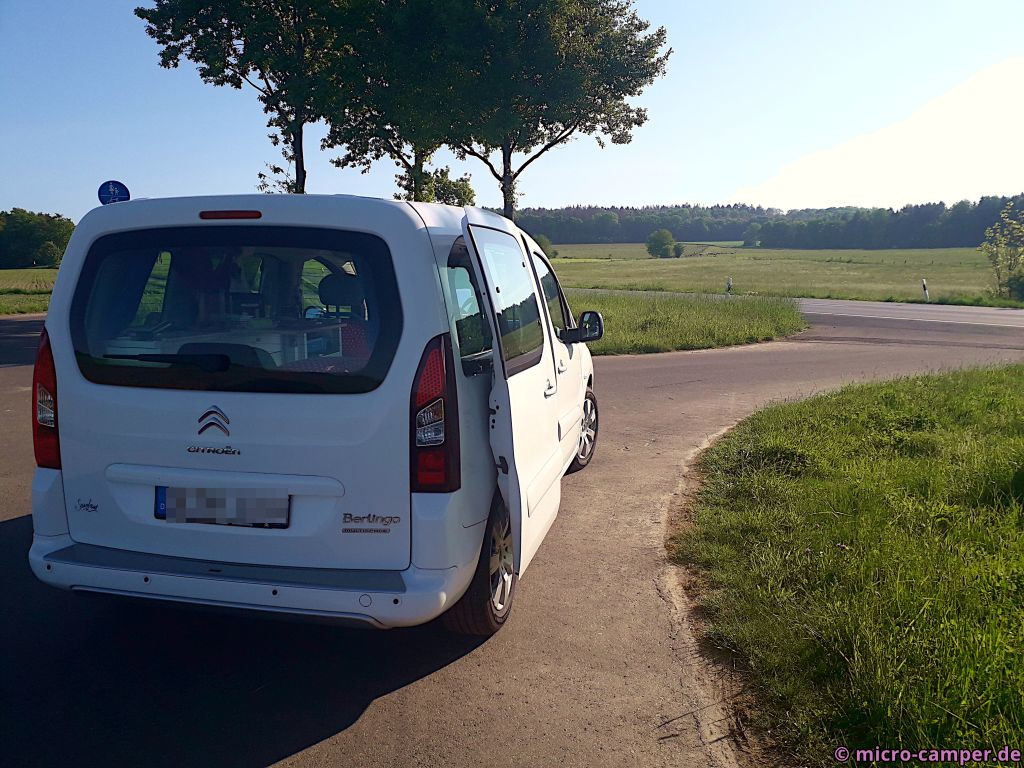 Ich habe unverschämtes Glück, die Sonne strahlt von einem stahlblauen Himmel herunter und ich kann endlich wieder mit meinem Micro Camper unterwegs sein! Deshalb gönne ich mir das Frühstück auch direkt unterwegs, ein nettes Plätzchen findet sich an einer Landstraße, mit Blick über Felder und Wiesen. Selbst das Geräusch, das die Kühlbox beim Anspringen macht, weckt in mir Urlaubsfreude! 😀