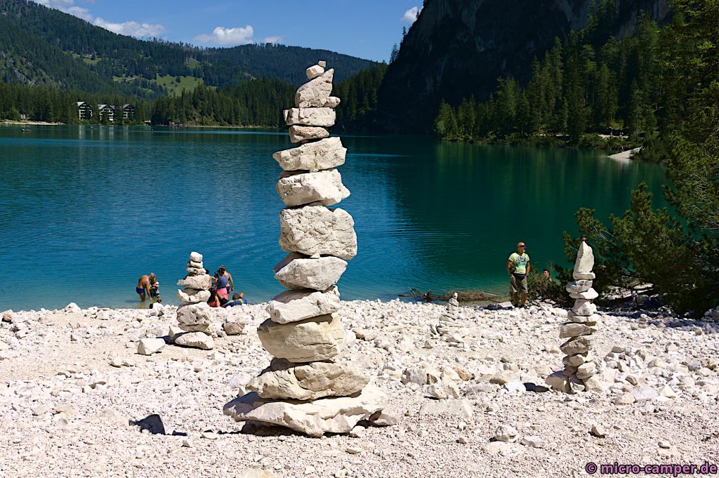 Ich hatte mir vorgenommen, bereits ganz früh am Pragser Wildsee zu sein, um ihn ohne Touristentrubel zu erleben. Aber mein Schlafbedürfnis macht mir einen Strich durch diese Rechnung. So starte ich am späten Vormittag die Umrundung des Sees. Die Farbe – oder besser: die Farben – des Wassers sind einfach unbeschreiblich schön. Überhaupt diese ganze Kulisse mit dem am südlichen Ufer aufragendenden Seekofel ist atemberaubend! Hier denke ich nun 18 Jahre zurück, an meinen Besuch des Lake Louise bei Banff in Kanada, der mich genauso beeindruckt hat. Damals wäre ich gerne mit einem Kanu auf dem Wasser unterwegs gewesen, aber das klappte aus verschiedenen Gründen nicht … Auf dem Weg um den See bieten sich immer neue wunderschöne Ausblicke, auch ein Angler versucht hier sein Glück. Nach etwa der Hälfte des Weges gehe ich ans Ufer des Sees, mache eine ausgiebige Jause und sauge den Eindruck dieser Landschaft in mich auf. Weiter geht es, nun auch ein Stück bergan, sodass man von weiter oben auf den See hinabblicken kann. Obwohl Montag, sind heute sehr viele Leute hier unterwegs, an Engstellen muss auch mal gewartet werden.