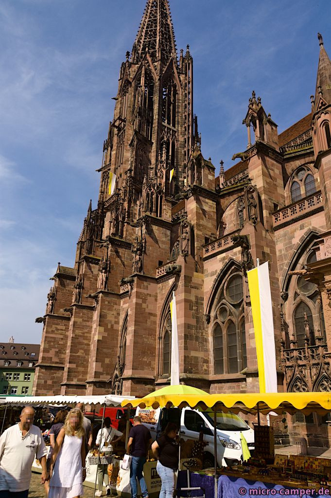 Das erste, was ich heute in Freiburg besichtige, ist also das Uniklinikum – das durchaus sehenswert ist. Es gibt zum Beispiel weitläufige parkähnliche Innenhöfe, in denen die Patienten spazieren können. Nach ein bisschen Suchen und Fragen finde ich endlich den hausärztlichen Notdienst. Mit Schonung, Kühlung und Antibiotikum in Tablettenform sollte der Stich sich bald in Wohlgefallen auflösen. Schonung, hm. Also sollte ich wohl nicht den Münsterturm raufklettern? Na gut, aber den Markt lasse ich mir nicht nehmen! Es ist herrlich, zwischen den Ständen zu spazieren, die bunten, leckeren und herrlich duftenden Produkte zu begutachten und das Treiben zu genießen, wie es sich seit hunderten von Jahren im Schatten des Münsters abspielt. Unter anderem kaufe ich einen Käsekuchen mit Heidelbeeren im Kleinformat für später (und er schmeckt himmlisch! 🙂 ).