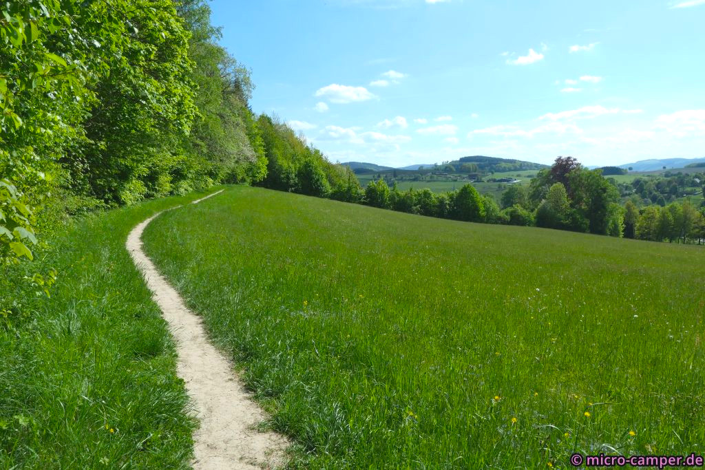 Der Weg führt aus dem Dorf heraus und dann abwechselnd durch herrliche Wiesen voller Löwenzahn, lichte Laubwälder und ein schmales Bachtal. Während meiner Pause kreist über mir ein Rotmilan! Auch Rehe kreuzen meinen Weg, rennen aber lieber weg, als sich von mir fotografieren zu lassen. Die Aussicht über das Schmallenberger Sauerland ist wunderschön, man kann die Stadt sehen und den nahegelegenen Wilzenberg, auf dem es auch eine vorgeschichtliche Wallanlage gibt sowie einen modernen Aussichtsturm. Durch Wiesen geht es zurück nach Holthausen.